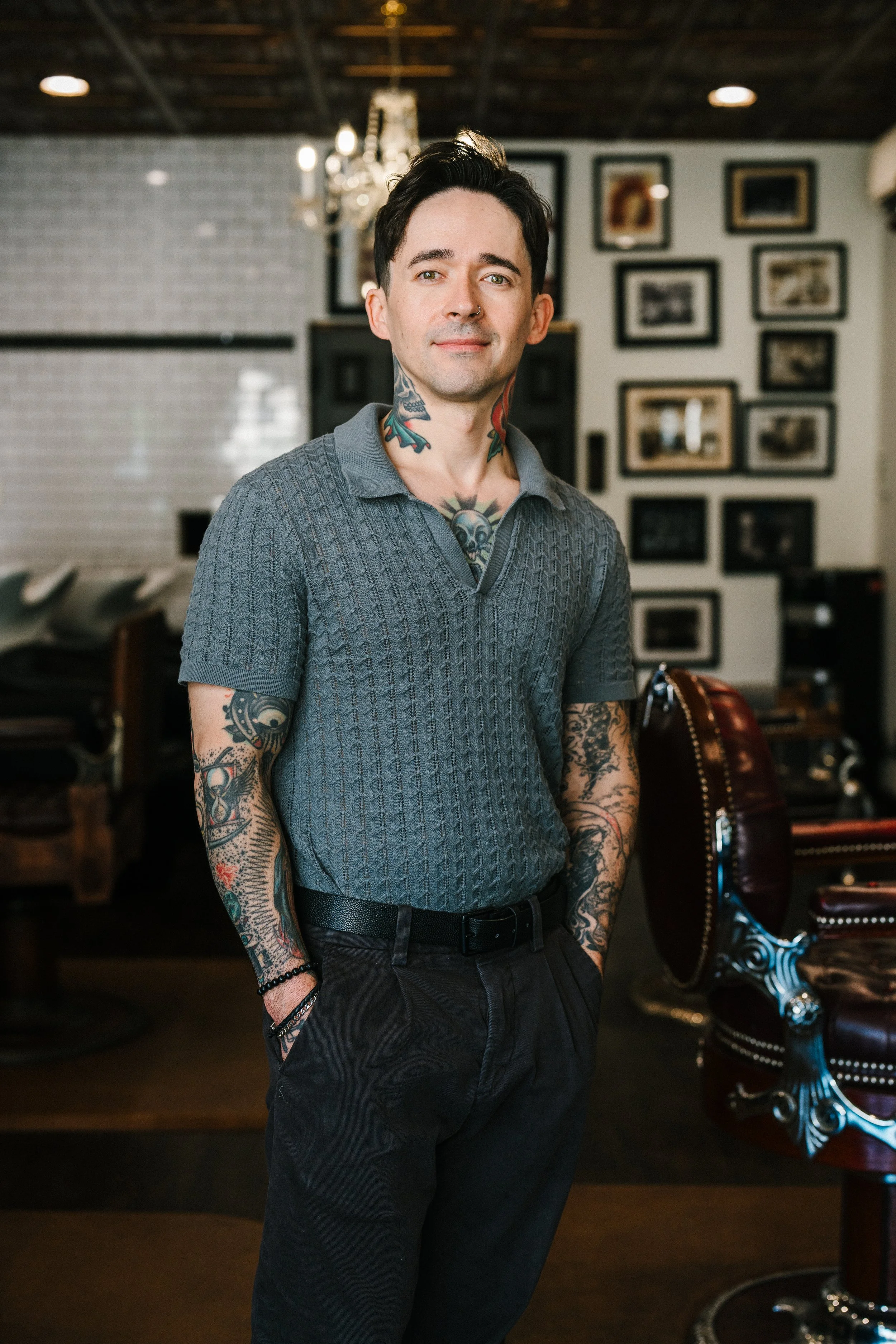 Outside the shop, Adam enjoys playing bass and guitar, discovering new music and art, cooking, and spending time hiking in the mountains. Spending time with family and friends. He also has a passion for formulating grooming products designed to help clients look and feel their best. His preferred sports are boxing and MMA, strictly as a spectator.
